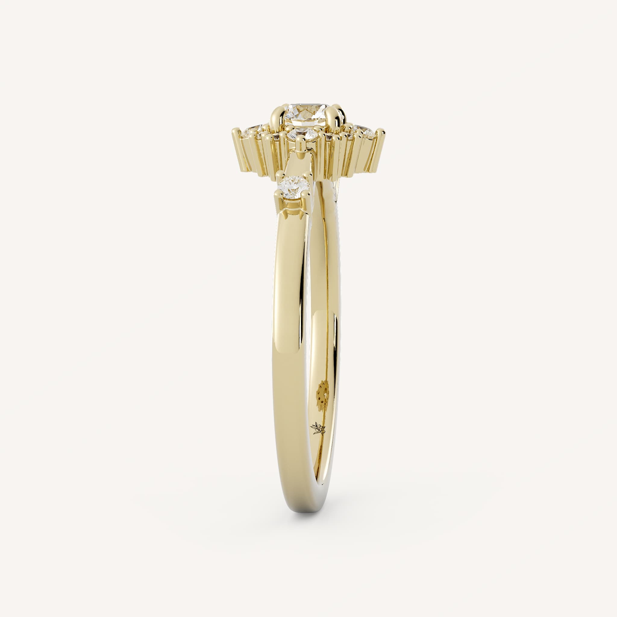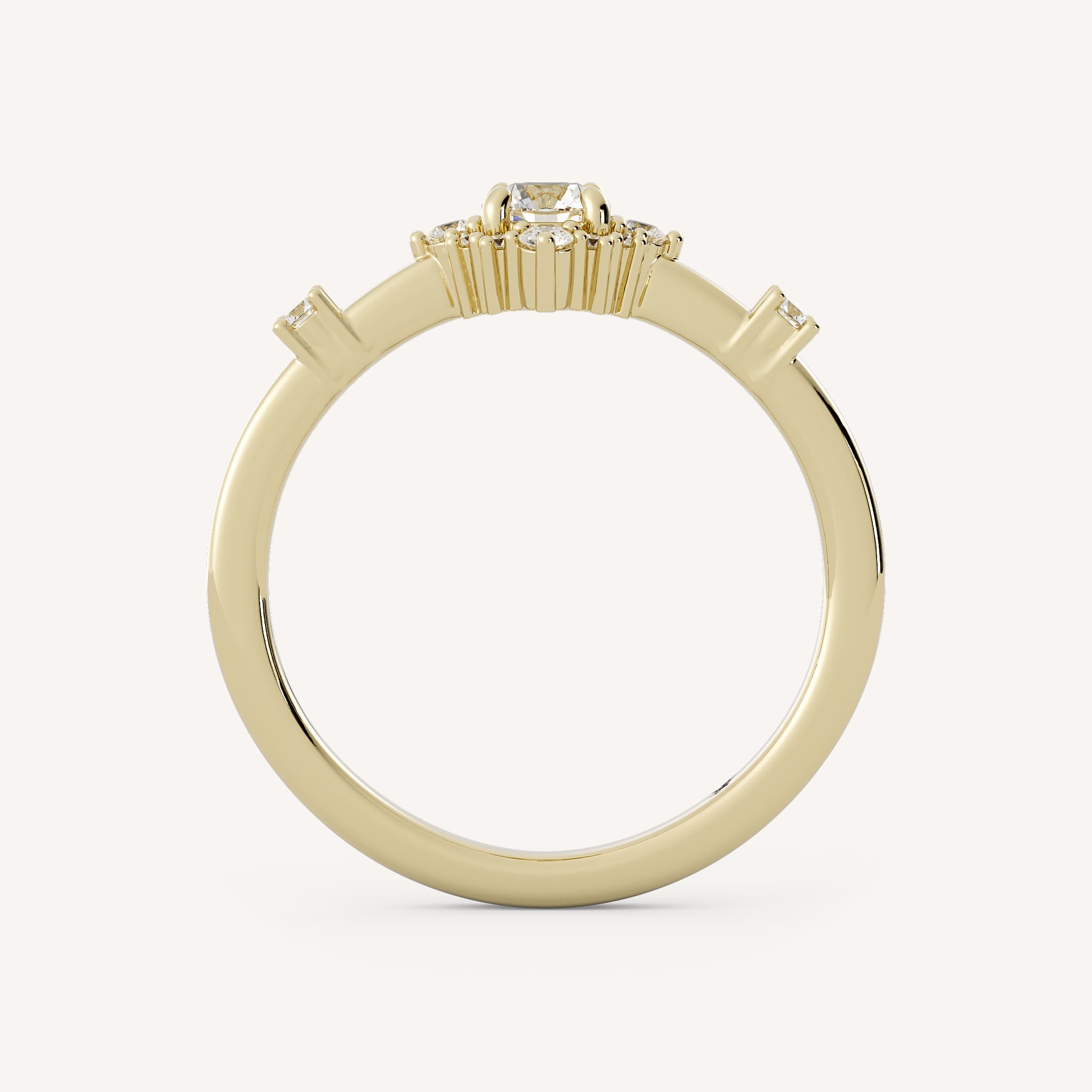 Winnie features a charming round center stone set with a burst halo and two round accent stones set flush on a half round flat edge shank.